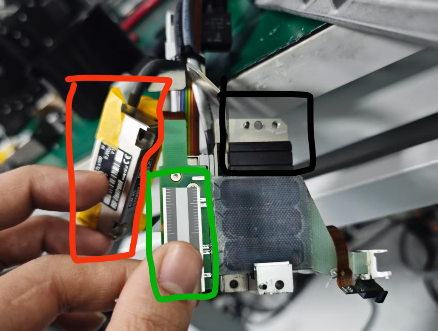 1.该型号贴片头z轴光栅尺是双面胶粘住的。在遇到z轴光栅尺掉落时笔者也是懵的。进行拆解z轴模块后得到后面图解:,红色读头部分,绿色z轴运动部分,黑色磁铁部分。