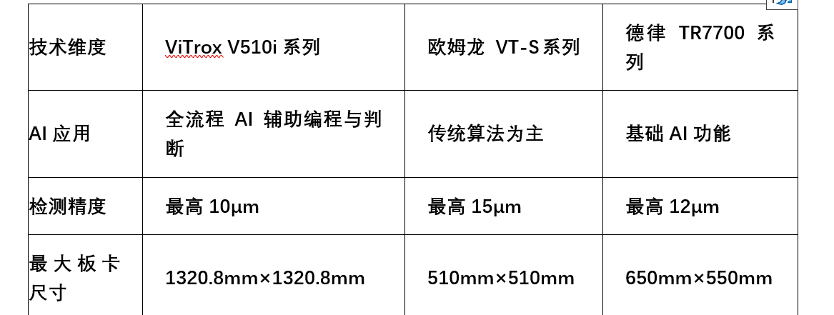 以下是ViTrox与欧姆龙、德律的AOI设备关键技术参数对比: