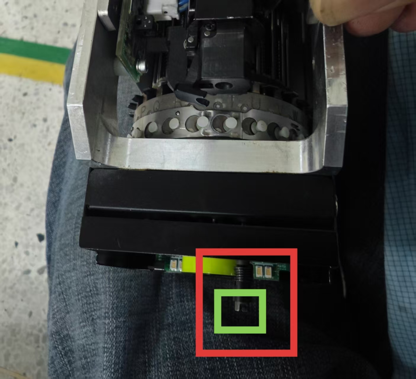 原因2:贴片头杆子内卡吸嘴的孔洞变形。杆子内孔洞的大小影响着吸嘴安装。看上图的绿色框内,通常是孔洞